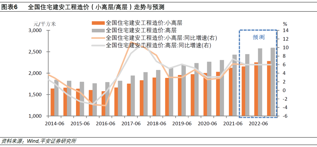 2)估算建安支出投资。我们将2022年新增保障房分为两类:一是新建,二是改建、扩建或其他。综合考虑各地政府引导存量改建、但盘活存量也存在客观难度,我们假设新建占比50%。据中国建设工程造价信息网数据,2021年上半年全国住房建安工程造价(小高层/高层)为2120-2426元/平方米,适当考虑2021年以来建材价格上涨情况(假设2022年建安工程同比增长6%),预计2022年全国新建保障房平均建安成本约为2500元/平方米(图表6)。另假设改建、扩建或其他部分的保障房平均建安成本为1000元/平方米。假设每套新增保障房平均面积为60平方米(保障性住房理论上每套不超过70平米)。我们测算,2022年新建保障房建安支出为1725亿元,改/扩建和其他部分建安支出为690亿元,合计2415亿元。