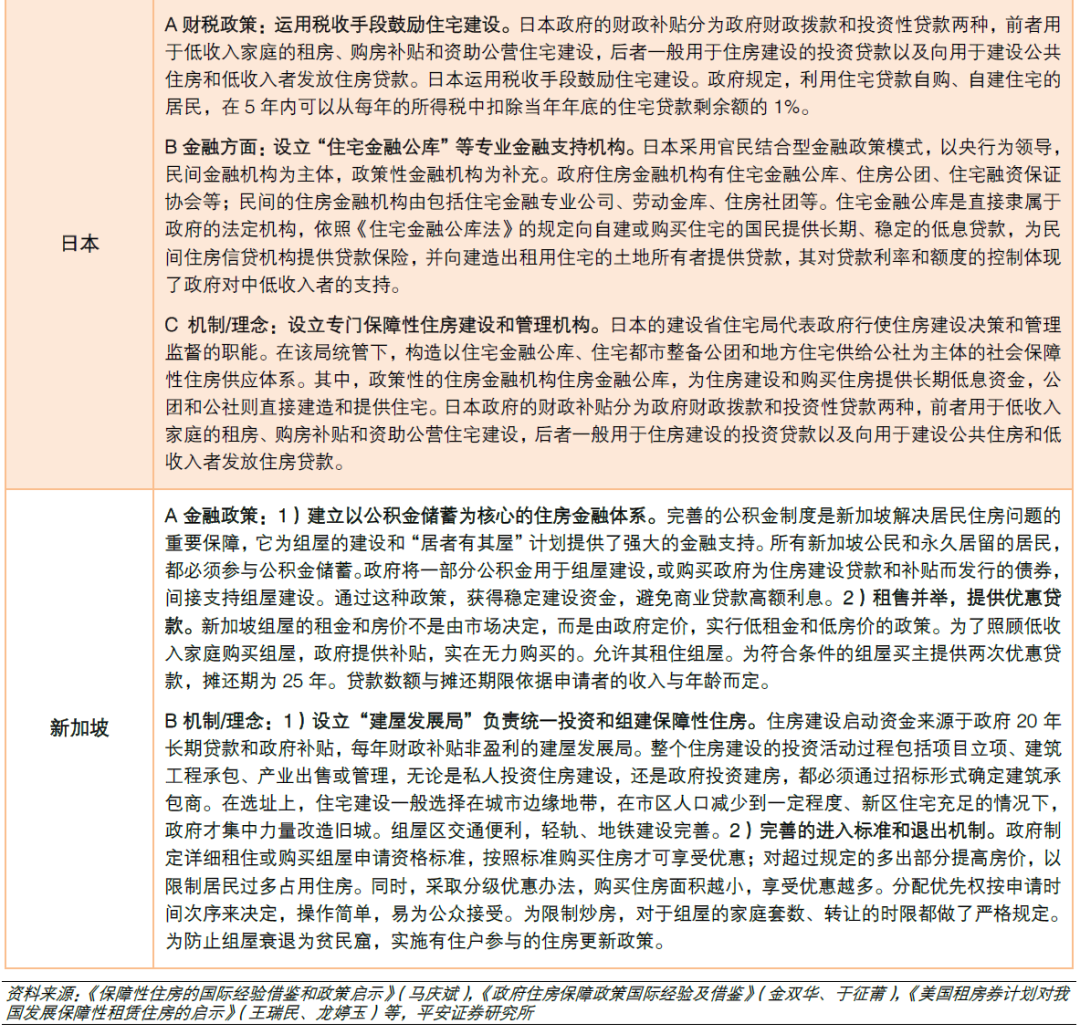金融支持方面,美国主要运用住房抵押贷款模式,向公共住房开发商和中低收入家庭提供低息贷款和提供贷款保险。德国实行“先存后贷”的合同储蓄模式,储蓄房贷利率低于市场利率且固定不变。日本的金融支持体系中,专门设立“住宅金融公库”向自建或购买住宅的国民提供长期、稳定的低息贷款。新加坡建立了以“公积金储蓄”为核心的住房金融体系。可见,保障性住房发展的金融支持需要有较强的针对性,在此基础上也可以考虑通过市场化手段增强金融支持的可持续性(如美国低息贷款和贷款保险、新加坡的公积金等)。