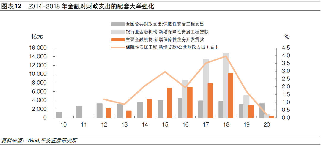 从上一轮保障房建设的实际情况来看(图表11):1)2014年之前,保障性安居工程的公共财政支出和金融配套均“不温不火”。2011-2013年,公共财政支出中的保障性安居工程相比2010年增长超过1倍,增量主要来自公共租赁住房、棚户区改造和其它保障性安居工程支出,对应于2011年中央政策的要求。以主要金融机构的新增保障性住房开发贷款作为观察金融配套的指标,其与公共财政支出的配比仅在0.6倍左右,考虑到这一贷款口径偏小(2016年起公布的更准确的:银行业金融机构新增保障性安居工程贷款,与此口径的比例常在1.7倍),实际金融与财政资金的配套强度也仅在1:1左右。