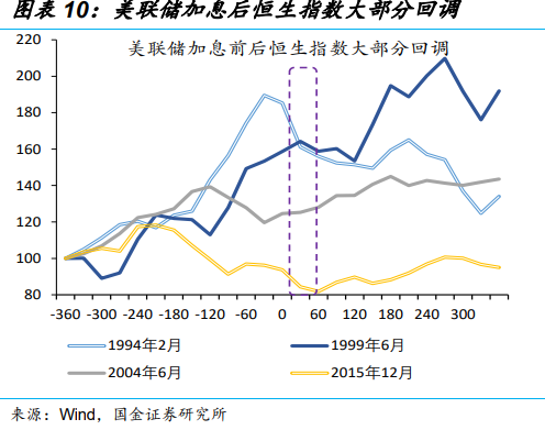 美联储货币政策收紧,对全球资本市场的冲击尚未充分定价;鉴往知今,美股波动放大阶段,港股市场交易情绪大多受到冲击。近些年来美联储加息周期,首次加息前后美股都经历了不同程度的回调。港股跨境资本流动相对自由,在联系汇率下,海外市场波动加大,对风险偏好的影响短期仍需留意。