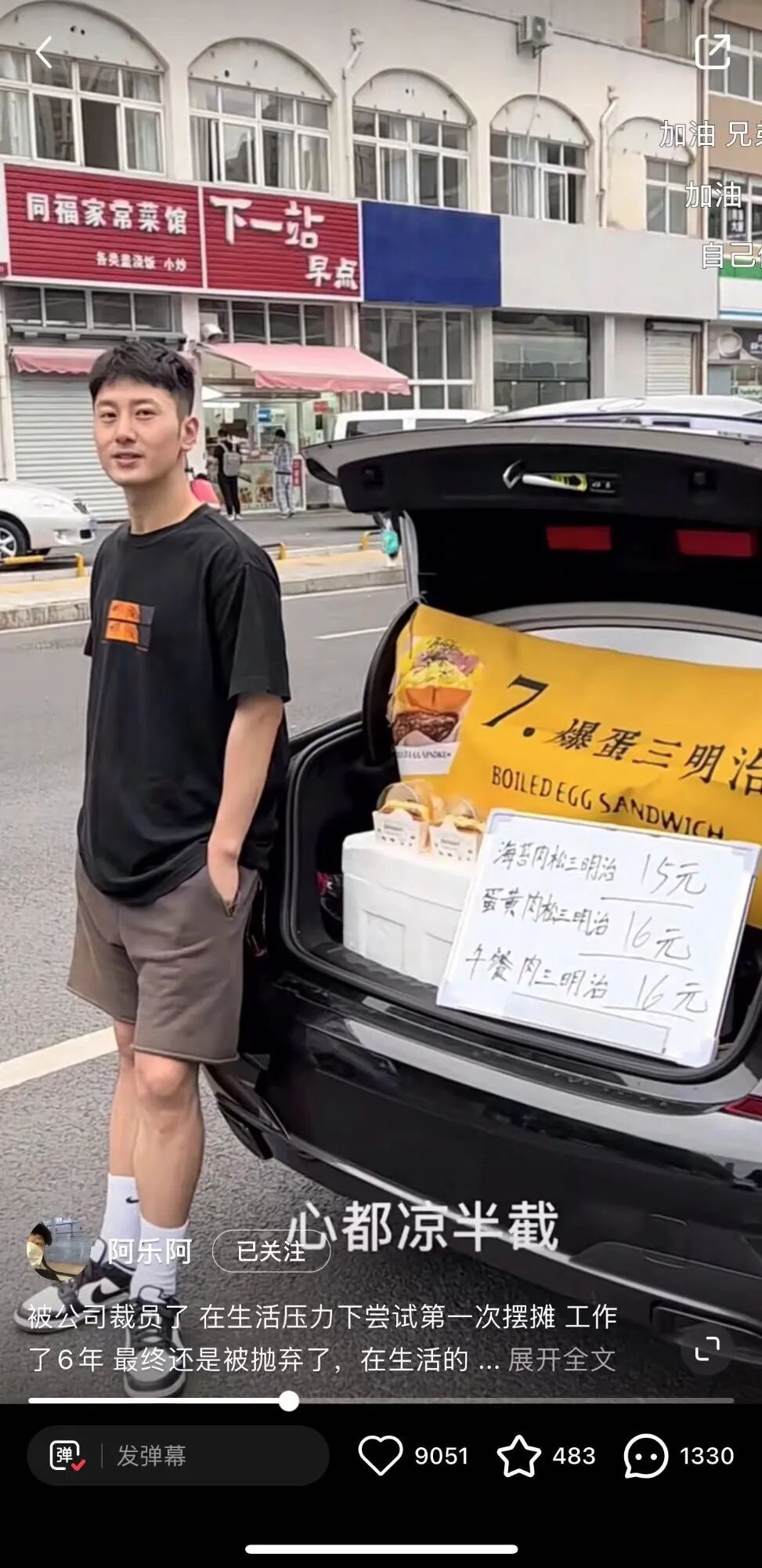 偌大的车尾箱后,挂着一张“爆蛋三明治”的黄色横幅;白色泡沫板作为招牌,写着三明治的品种和标价;在车尾箱旁,穿着黑色上衣的阿乐双手插兜,面带微笑——他正等待今天的第一个客人。