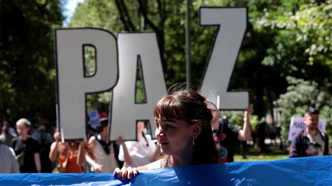 这是6月26日在西班牙马德里拍摄的游行现场。数千人26日在西班牙首都马德里市中心参加反对北约、呼吁世界和平大游行。新华社发(胡安·卡洛斯·罗哈斯 摄)