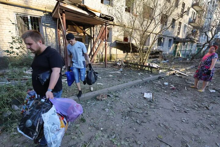 6月20日,顿涅茨克当地居民从被损坏的建筑撤离。新华社发(维克托摄)
