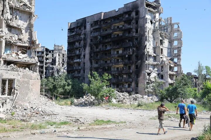 6月18日,当地居民从马里乌波尔的受损建筑旁走过。新华社发(维克托摄)