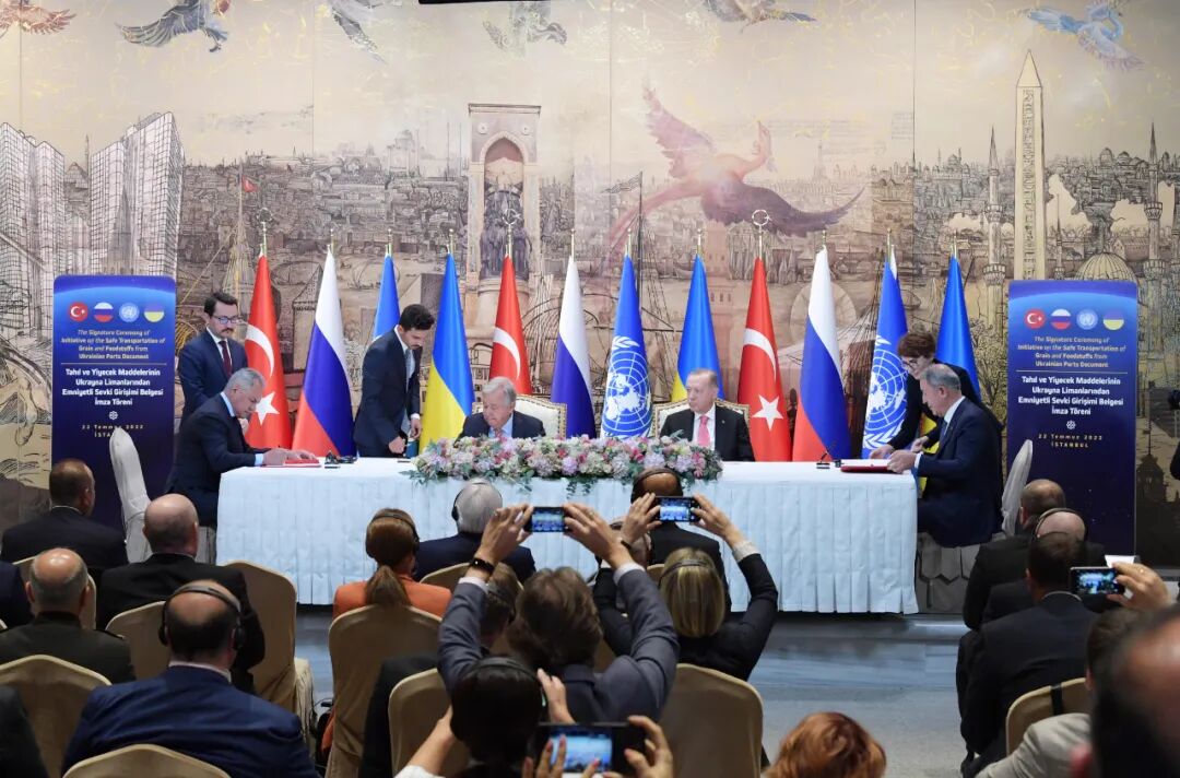 7月22日,在土耳其伊斯坦布尔多尔玛巴赫切宫,土耳其国防部长阿卡尔(右)、联合国秘书长古特雷斯(中左)与俄罗斯国防部长绍伊古(左)在签署协议。新华社记者沙达提摄