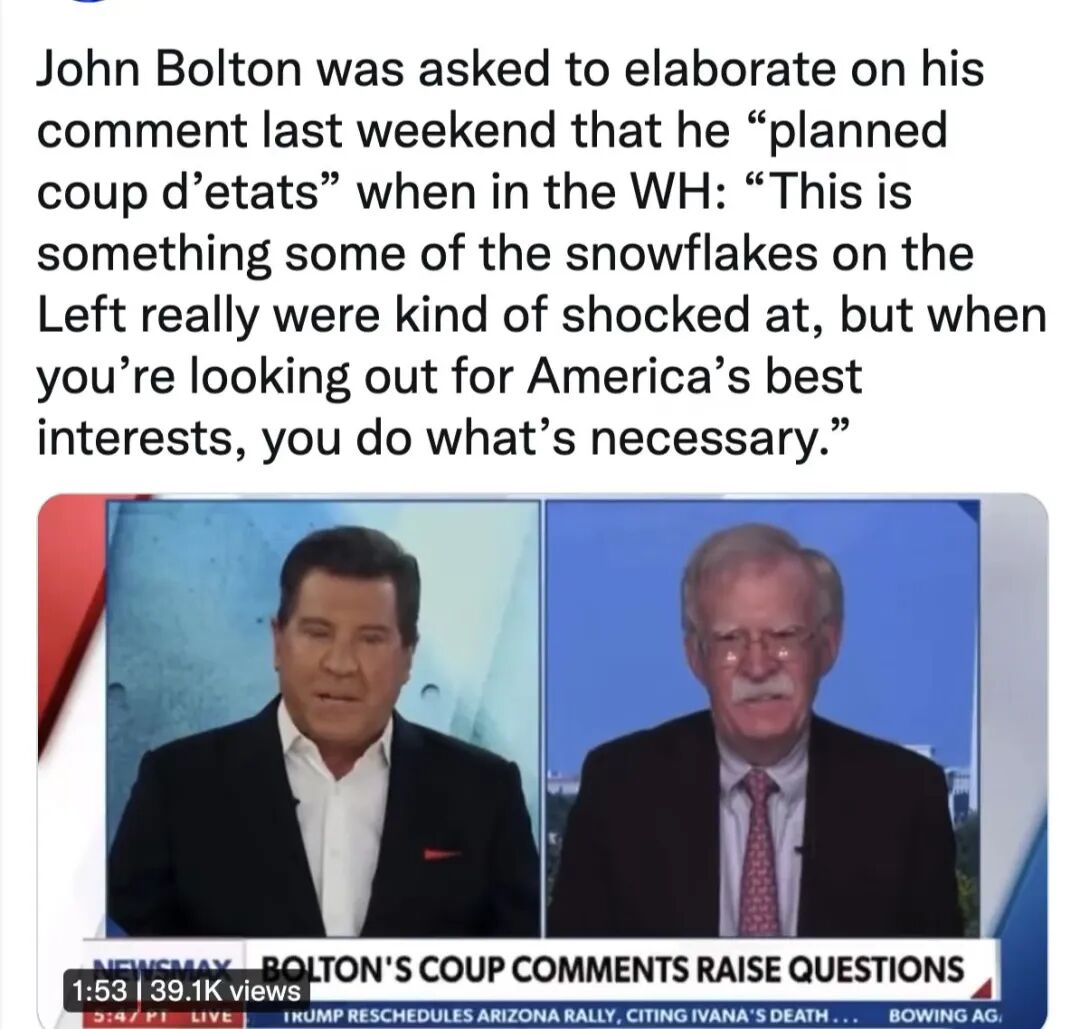 美国前总统国家安全事务助理约翰·博尔顿几天前在接受媒体采访时“自曝”曾协助策划他国政变,日前又接受媒体采访为这段言论辩护,称“为了美国最大利益,这就是该做的”。
