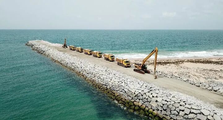这是2018年3月29日在尼日利亚拉各斯州莱基深水港拍摄的防波堤。莱基深水港一期投资建设两个集装箱泊位。一期工程由中国港湾承建。(新华社发,蒋新彤摄)