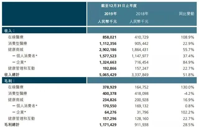 微医的业务被划分为微医疗、微医药、微医保和微医云几大板块,而市场预计微医云将不参与此次IPO融资。具体经营范围涵盖保单、医疗用品、在线预约和实体诊所等,目前在中国大陆已拥有超过2.1亿注册用户。微医还与大约3200家医院和3.6万名医生建立了联系。2016年,公司形成微医疗、微医药及微医险三大核心业务体系,全年营收共计12亿元,这三项业务均实现盈利,营收占比依次约为45%、20%、30%,利润约2.8亿元。此后财务业绩暂无披露。显然,微医的起家业务挂号网,并不是目前公司变现的主要依托,它基本上是平台其他业务的导流入口。微医董事长兼CEO廖杰远曾公开表示,截至2016年,公司变现程度最高的是健康险,占当年营收60%,16家互联网医院业务的总流水8亿元中也有大部分与健康险重合。除了网上卖药获利,挂号业务主要赚的主要是保险的钱,也促成了微医初期盈利。这与平安好医生非常类似:平安好医生的在线医疗业务商业化途径是向平安寿险和平安健康险的保单持有客户提供“家庭医生”服务、一站式会员服务(付费)等;而平安好医生向平安寿险、平安健康险收取年度服务费。此业务2019年收入占比16.9%,毛利占比32.3%,拥有较强的变现能力。![]()