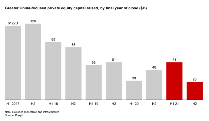 事实上不只美元基金,数据显示,2021年下半年,国内美元和人民币基金的募资总额仅为280亿美元,比上半年下降了54%,同比则下降了41.7%。这是自2014年上半年以来的最低半年数据。