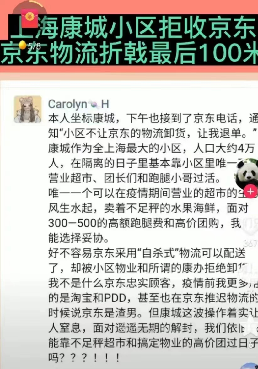 几天前,本频道发布《京东为上海民生全力以赴》,部分网友还有点不相信京东的良心。现在好了。京东动员全国若干大卡车和3000名小哥紧急驰援上海,朗朗乾坤,却深陷上海滩泥沼,有些小区差100米,就不让京东快递哥进,也不让住户出来拿,志愿者忙团购更不帮送!天理何在?荒诞复荒诞!荒诞本质上即是分裂。谁来、怎么来修补这个巨大裂缝?!