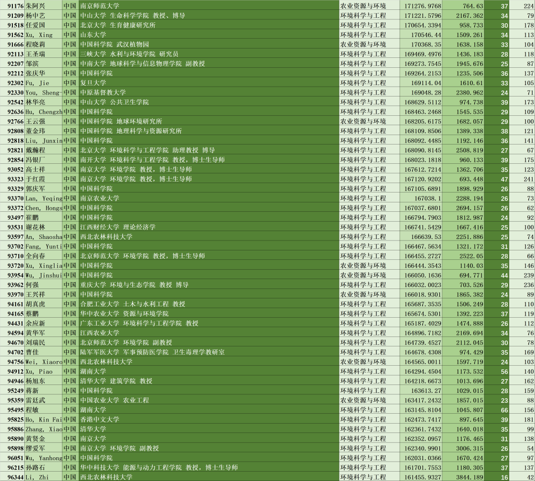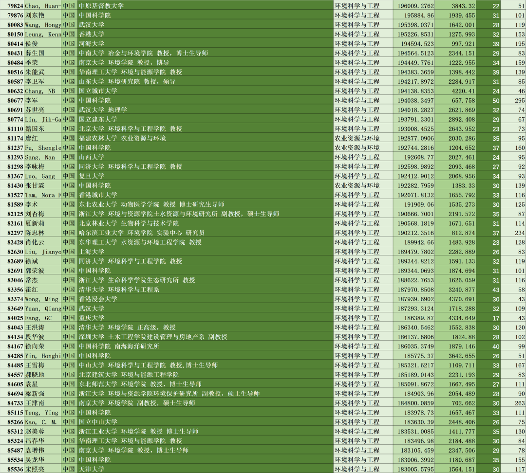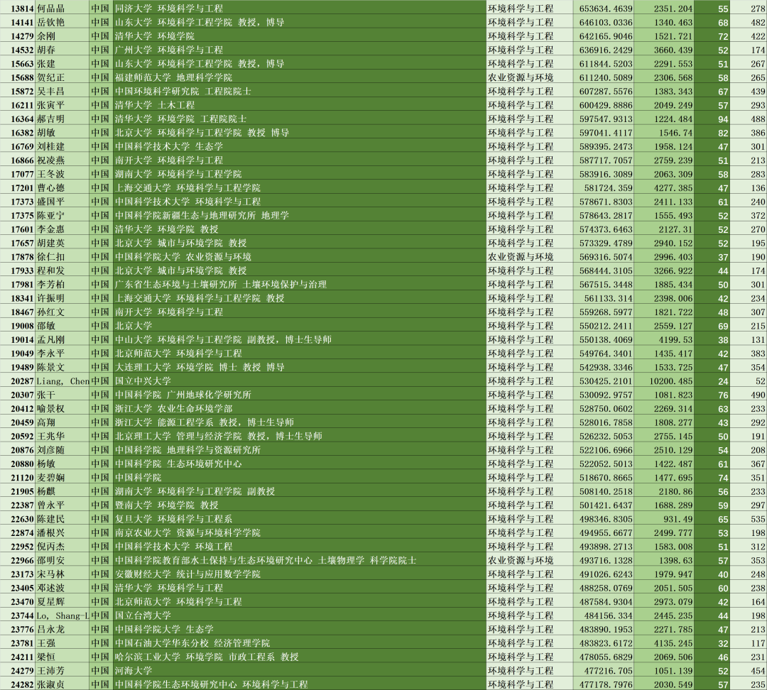 此次榜单共10万名科学家登榜,中国共计11642名科学家登榜,仅次于美国(38449人),其中环境科学与工程、农业资源与环境领域共637名科学家入选(注:部分环境学领域专家或被划分至化学、材料学等,故不在此名单内)。