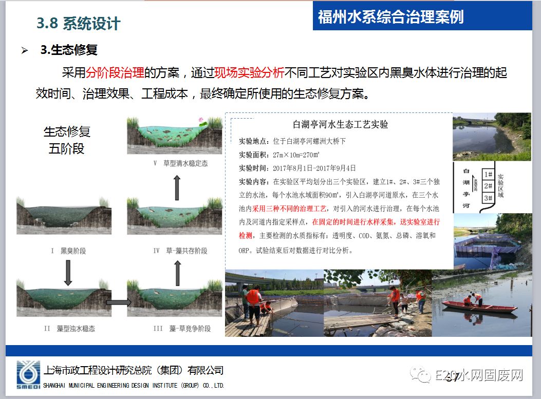 第四、系统设计:水环境整治系统设计,应以水环境质量为目标,以现状问题为导向,以污染总量控制为依据,采取“源头、过程和末端相结合、绿色和灰色相结合、工程与非工程相结合”的工作思路,要考虑多种技术手段、多部门协作、多专业统筹。