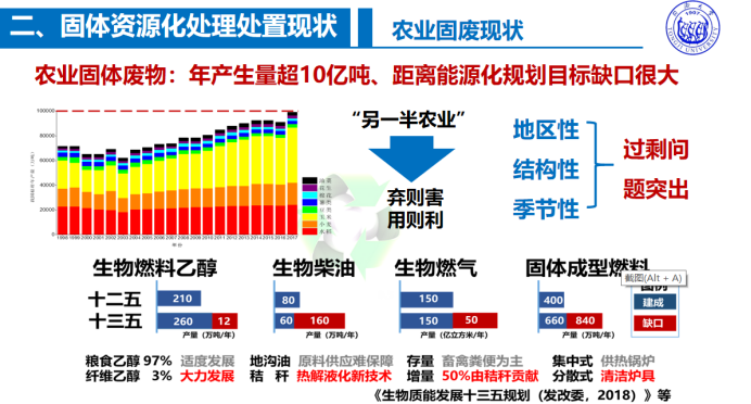 农村固体废弃物方面。农村秸秆问题还没有解决。目前我国农业固体废物,年产生量超10亿吨、距离能源化规划目标缺口很大。
