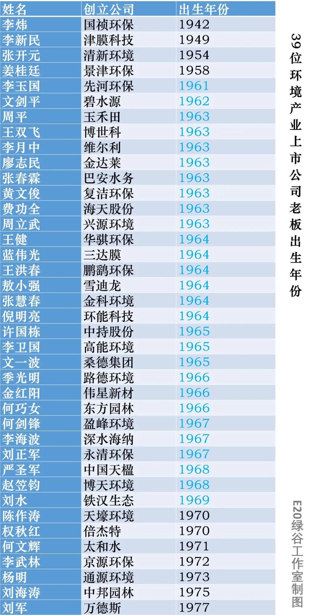 从中可以看出,有8位环境产业上市公司老板出生在1963年,这一年是水兔之年,仿佛能够助力环境创业——此玄学研究已超出我的研究范围,只为博君一笑。
