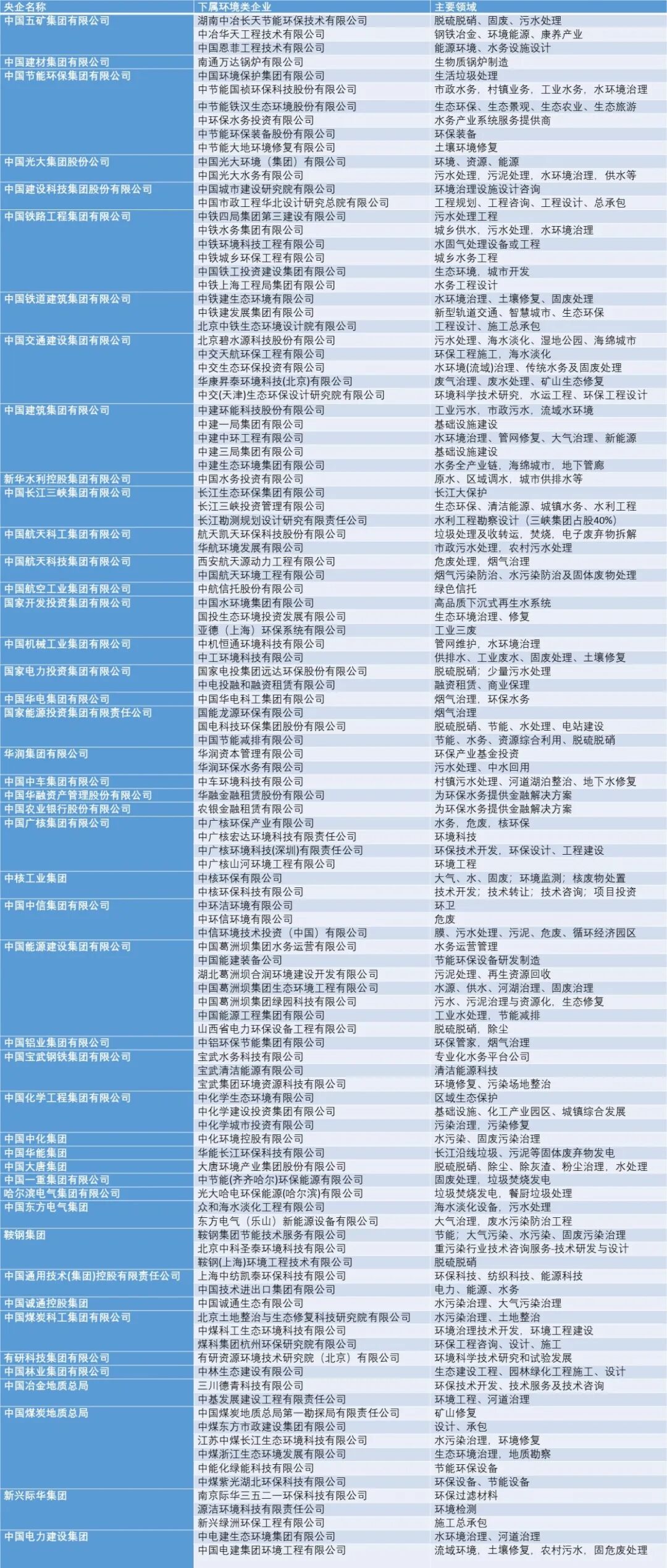 央企及其下属环境类企业统计表