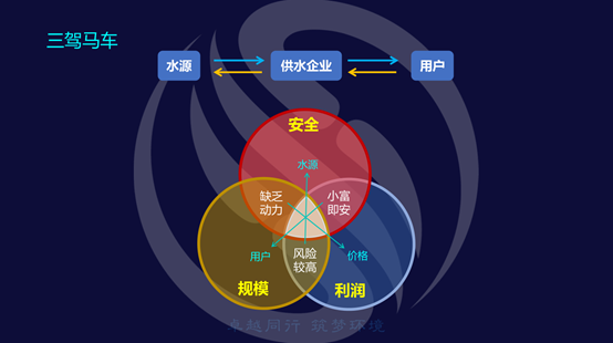 最后,回到前面提及的战略分析工具箱。第一,作为民生基础公共服务,安全是地方水务企业立足的基点和根本;第二,受国资委考核的要求,大家会不断把企业做大做强,扩充规模和资产;第三,企业也需要合理的利润保障继续发展。想要同时实现安全、规模、利润之间的良好平衡确实很有难度,大部分企业仅仅能同时做到三者中的任意两者。