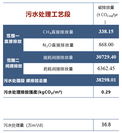 通过计算得出,按照核算范围评估,能耗类间接排放量占比最大达到80%,药耗间接排放量占17%,CH4和N2O的直接排放仅占2%和1%。按照工艺段评估,生物处理段碳排放量占比最大,已经超过50%。其次是深水处理段和辅助设施段的碳排放量,预处理段和出水段的碳排放量占8.91%和3.62%。