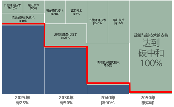 在“双碳”目标下,上海城投做了非常大胆的展望。“2025年节能降耗技术降10%的CO2排放量,碳汇技术降5%的CO2排放量,清洁能源替代技术降10%CO2排放量,2025年整体降25%;2030年降30%CO2排放量,2040年降90%CO2排放量,直到2050年政策与新技术的支持达到降低100%CO2排放量,实现我国的碳中和目标。”