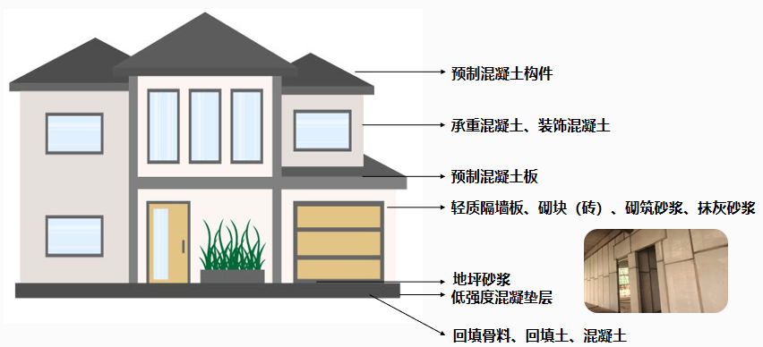 比如,在住宅建筑应用体系中,如图所示,从上到下,可以应用到一些再生建筑材料,比如预制混凝土构件、承受混凝土、装饰混凝土、预制混凝土板、轻质隔墙板、地坪砂浆、低强度混凝垫层、回填骨料、回填土、混凝土等。