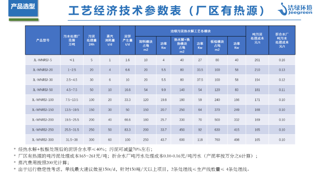 各类情况下设备选型表。基于不同工况下运行时间和污水处理量的差别,洁绿环境提供了相应的设备选型表。洁绿环境的污泥热水解设备处理规模范围为5~300吨/日,根据工程实践,日处理量150吨/日以上的项目采用两条处理线更加合理可靠。