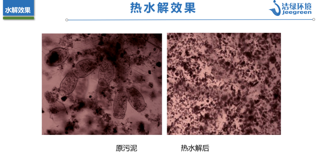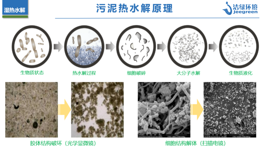 热水解技术工作原理。热水解技术的原理是通过高温高压蒸汽与污泥进行接触,通过反应器中高温高压过程,让污泥中微生物细胞破碎、大分子水解、生物质液化。从光学电镜和扫描电镜可以明显看出胶体结构破坏与细胞体的解体。热水解不仅能提高污泥脱水性能,高温高压过程还可杀灭污泥中的有害微生物,为后续资源化利用提供了便利和条件。目前,在新冠疫情相对常态化的背景下,病毒从污水进入污泥,也会存在潜在的传播风险,因此快速消灭污泥中有害微生物就显得尤其重要。