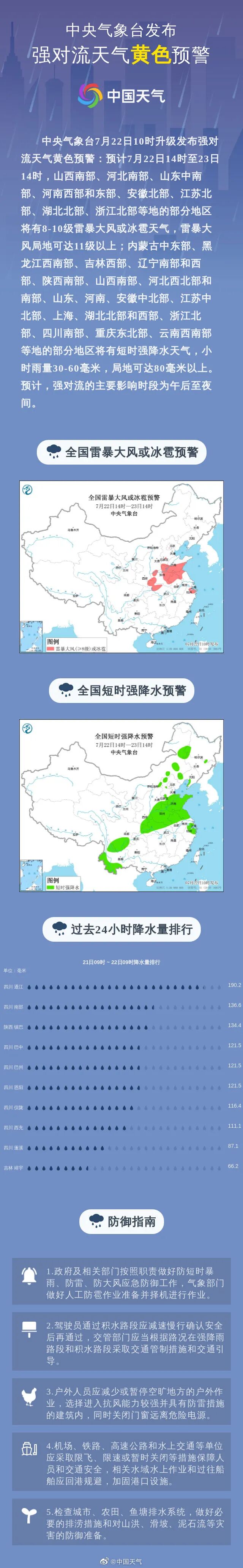 预计7月22日14时至23日14时,山西南部、河北南部、山东中南部、河南西部和东部、安徽北部、江苏北部、湖北北部、浙江北部等地的部分地区将有8-10级雷暴大风或冰雹天气,雷暴大风局地可达11级以上;内蒙古中东部、黑龙江西南部、吉林西部、辽宁南部和西部、陕西南部、山西南部、河北西北部和南部、山东、河南、安徽中北部、江苏中北部、上海、湖北北部和西部、浙江北部、四川南部、重庆东北部、云南西南部等地的部分地区将有短时强降水天气,小时雨量30-60毫米,局地可达80毫米以上。预计,强对流的主要影响时段为午后至夜间。