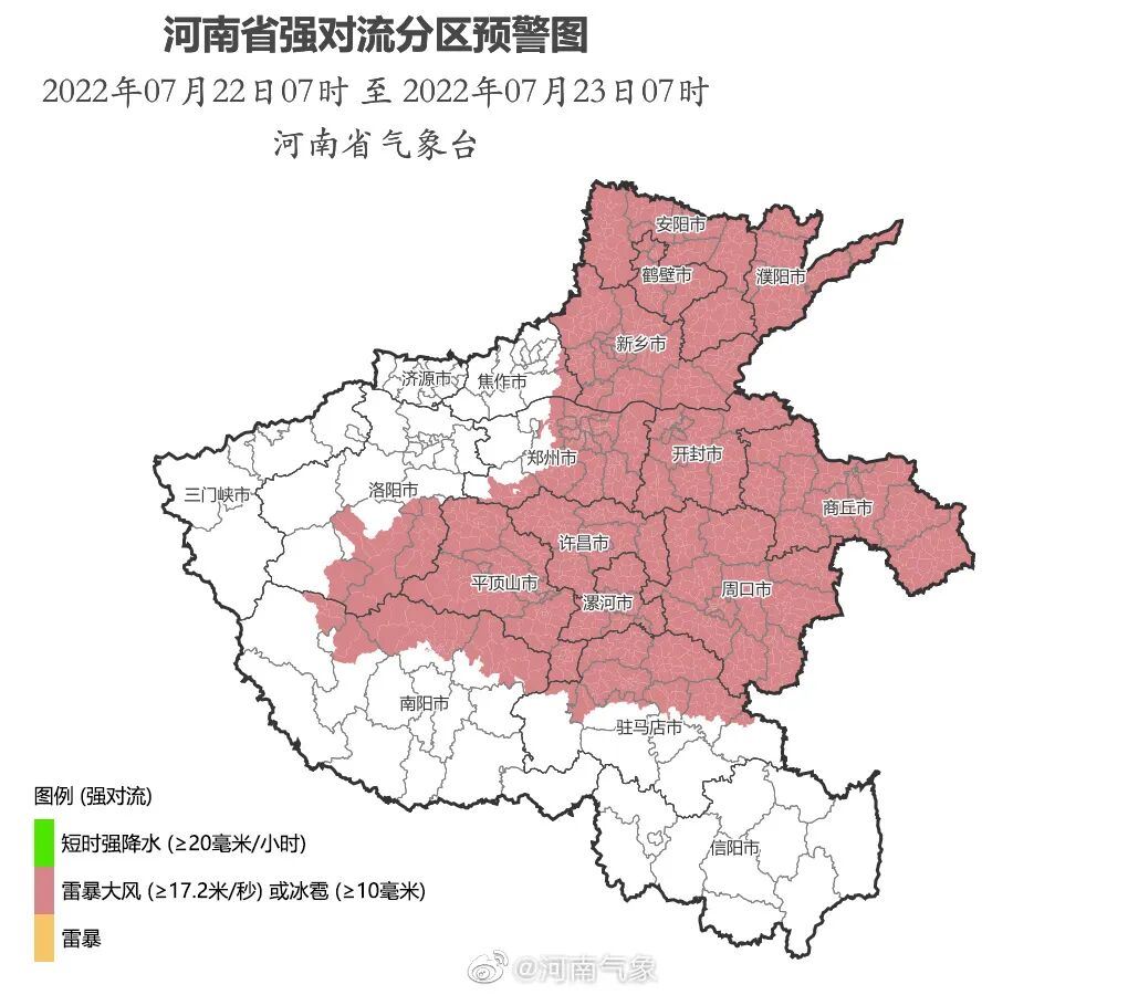 与此同时河南省气象台7时发布强对流蓝色预警:预计7时至23日7时,安阳、鹤壁、濮阳、新乡、洛阳东部和南部、平顶山、南阳北部、郑州东部和南部、许昌、漯河、开封、商丘、周口、驻马店北部等地的部分县市(区)将出现8级以上雷暴大风或直径10毫米以上冰雹,局地风力可达11级以上;淮河以北部分县市(区)将有短时强降水天气,小时雨量30-60毫米,请密切关注属地气象部门发布的最新预报信息和气象灾害预警信号,做好防范应对工作。上述地区的相邻县市(区)也需关注。