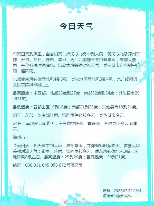 7月22日7时,省气象台发布暴雨Ⅳ级预警和强对流蓝色预警,预计22日07时至23日07时,黄河以北、郑州东部和南部、开封、商丘、许昌、漯河、周口北中部等地的大部分县市(区)将出现暴雨,其中安阳东南部、濮阳东部、新乡东北部、开封东部、商丘中西部、周口北部局地将出现大暴雨,安阳、鹤壁、濮阳、新乡、洛阳东部和南部、平顶山、南阳北部、郑州东部和南部、许昌、漯河、开封、商丘、周口、驻马店北部等地部分县(市、区)将出现雷暴大风和短时强对流天气。