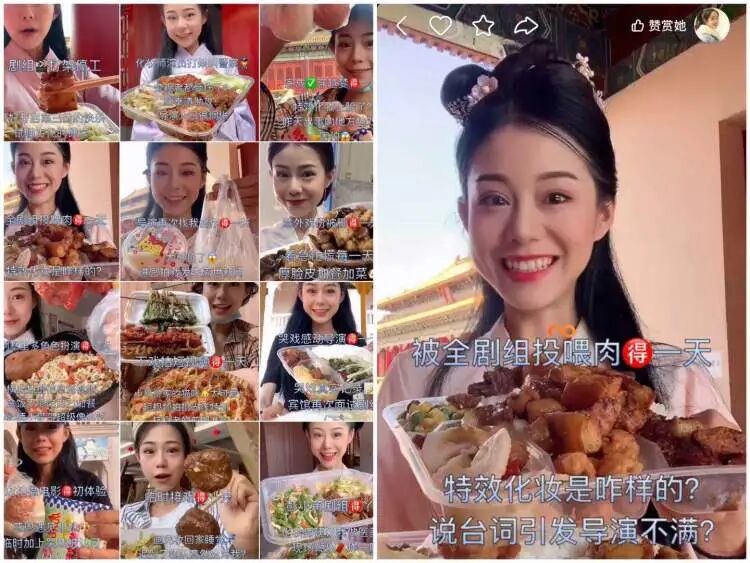 阿行爱吃、菲菲、横店小忆,就是快手平台上人气比较高的龙套博主。阿行和菲菲还是在校大学生,解说剧组每日盒饭、妆发是他们短视频的主要内容。除此之外菲菲还在经营快手小店,下戏的时间直播、连麦pk。横店小忆因为声音神似被网友们称作“横店周星驰”,他时常把自己在剧组编排的段子拍到视频里。