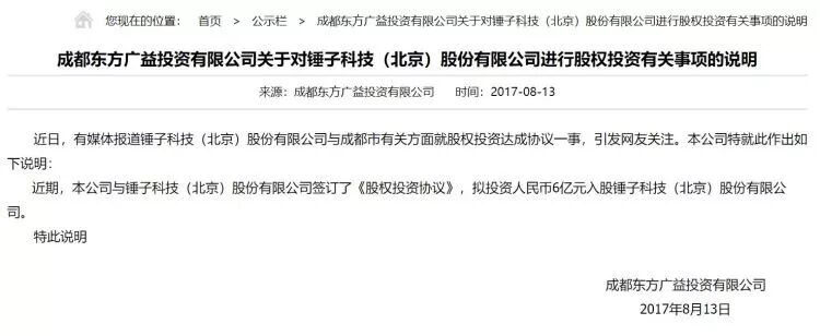 据悉,锤子科技2017年的近10亿元融资中,成都东方广益投资有限公司出资6亿元,其他私募基金投资为3亿到4亿元。
