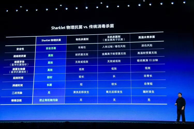 “鲨纹技术能够抑制细菌生长,但是并不是杀死细菌”,罗永浩在发布会上表示,“正如人在沙漠中无法生存,并不是因为沙漠能够杀死人,而是人在沙漠中因为缺水等原因无法生存。