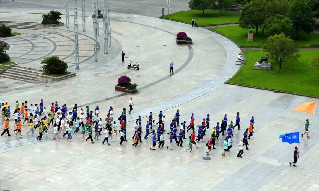 师生们身着印有校徽的五彩运动服从腾骧楼启程,神采奕奕地踏上平日里熟悉的一寸寸土地,浩浩荡荡的队伍犹如一条长龙穿梭在校园,形成一道斑斓的风景。