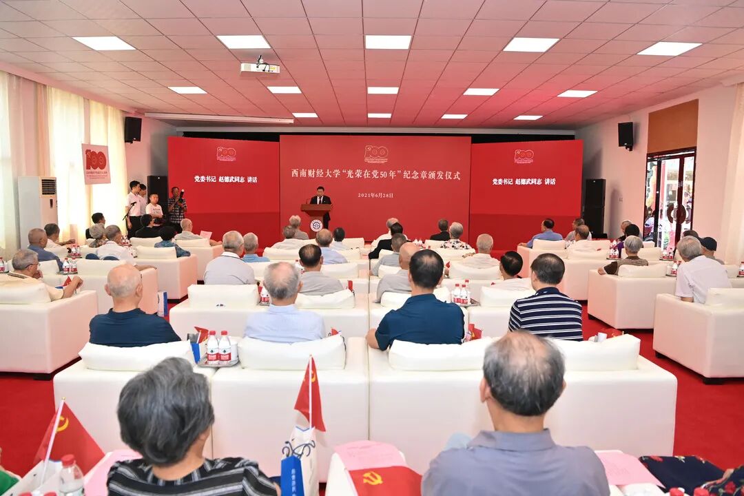 6月28日,西南财经大学“光荣在党50年”纪念章颁发仪式在光华校区文渊园隆重举行,学校为光荣在党50年的98名老党员颁发纪念章,向伟大的中国共产党成立100周年深情礼赞,向为党和国家的教育事业、为学校发展做出重要贡献的学校老党员诚挚致敬。党委书记赵德武在仪式上讲话,党委副书记、校长卓志主持仪式;党委副书记马骁、曾道荣,党委副书记、纪委书记范卫宏,党委常委、副校长史代敏,学校各学院中心、职能部门负责人参加了仪式。