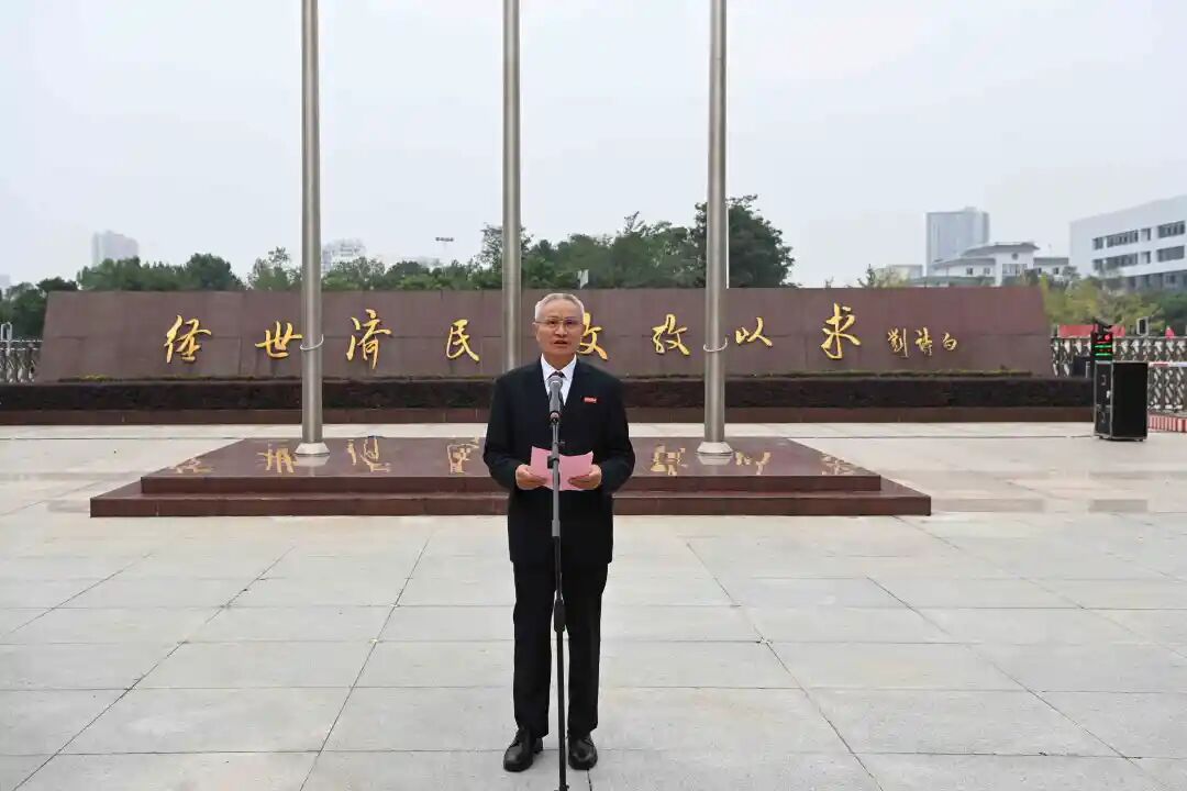 升国旗仪式上,曾道荣、欧兵分别发表热情洋溢的讲话,向新中国72周年华诞致以深情祝福,向为民族独立、人民幸福建立不朽功勋的革命先烈表示深切怀念,向全校师生员工致以节日的祝贺。他们深入回顾了新中国成立72年来中国共产党团结带领全国各族人民取得的举世瞩目的伟大成就,深情祝愿伟大祖国繁荣富强、人民幸福安康。他们指出,爱国在心,强国在志,报国在行。爱国之心,是再朴素不过的情感;强国之志,是再应该不过的抱负;报国之行,是再自然不过的选择。他们希望,同学们要立大志、明大德、成大才、担大任,自觉用习近平新时代中国特色社会主义思想武装头脑,深刻认识中国共产党为什么能、马克思主义为什么行、中国特色社会主义为什么好,自觉增强“请党放心、强国有我”的使命担当,将爱党、爱国、爱社会主义的深厚情感落实到奋斗实践中,争做有志气有骨气有底气的时代新人,以青春之我创造青春之国家、青春之民族,让青春之花在为祖国、为民族、为人民、为人类的不懈奋斗中绚丽绽放。