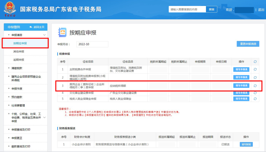 登录广东省电子税务局网站,依次选择【我要办税】—【税费申报及缴纳】—【申报清册】—【按期应申报】—【税费申报】—【居民企业(查账征收)企业所得税月(季)度申报】—【填写申报表】。