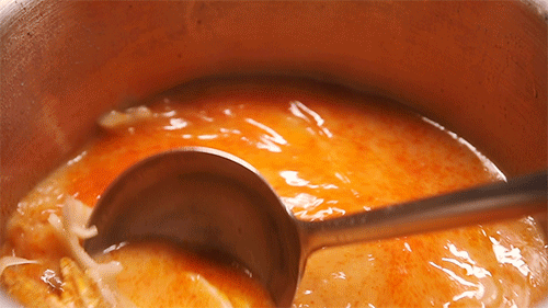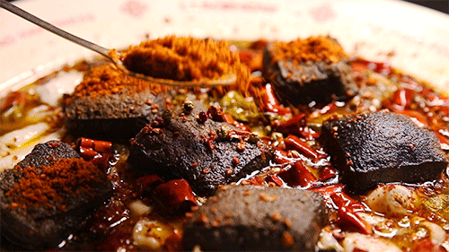 卤制臭豆腐经过油炸之后,加入蒜泥、红辣椒猛火翻炒,趁热浇在酸菜鱼上,红油滋啦滋啦作响,香气直接冲进鼻腔里!再用辣椒面点缀,完美!