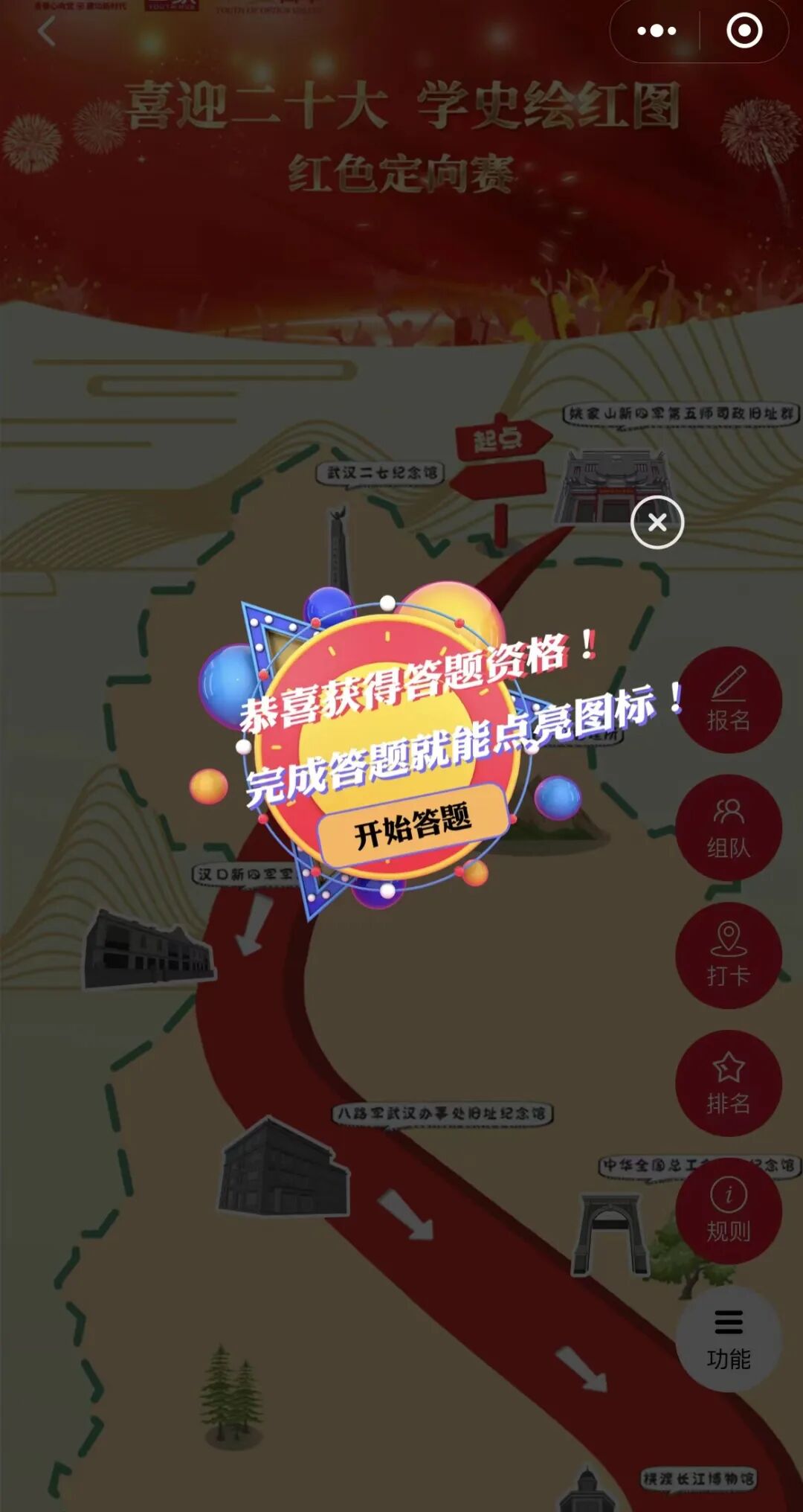 2.当日步数达8000步及以上,点击“地图”上任意红色地标,即可开始答题。答对十题可点亮一个红色地标;若答错,分享活动即可获得1次“继续答题”机会;