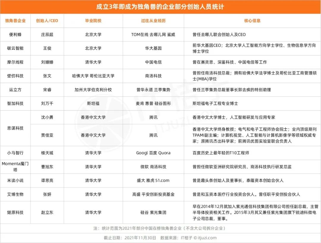 巨头基因的企业自带明星光环,而另一些企业本身与大公司并无关联,也能在成立 3 年内成为独角兽的企业——他们的创始团队大有「故事」可讲。分析部分速成独角兽企业创始人员学历及过往从业经历,名校及名企标签属性明显。