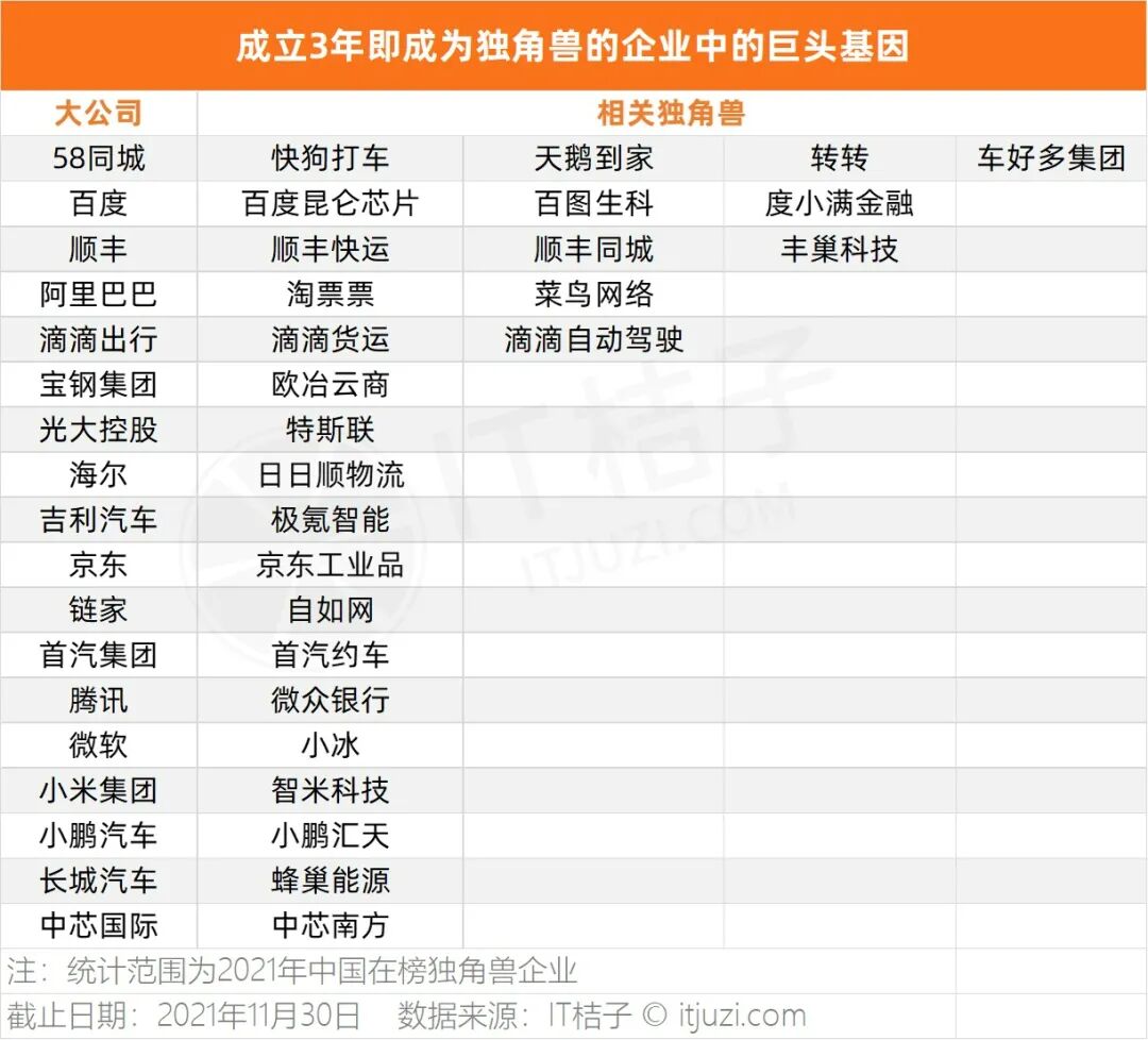 据 IT 桔子统计,成立 3 年内估值就已突破 10 亿美元的 72 家独角兽企业中,有 27 家「有巨头企业基因」,占比 37.5%。这些独角兽或是从巨头直接拆分成为独立公司,或是独立对外进行过开放融资。他们在独立面向资本市场时,就已组建较为成熟的团队,加之大公司平台和资源支持,企业发展速度加快。另外,他们拥有大公司品牌背书,更容易得到资本的关注和青睐,也更容易实现估值翻倍,从而迈进 10 亿美元估值的独角兽俱乐部。比如前不久小鹏汽车刚推出的城市空中飞行汽车品牌「小鹏汇天」,直接就带着 5 亿美元融资出场了。