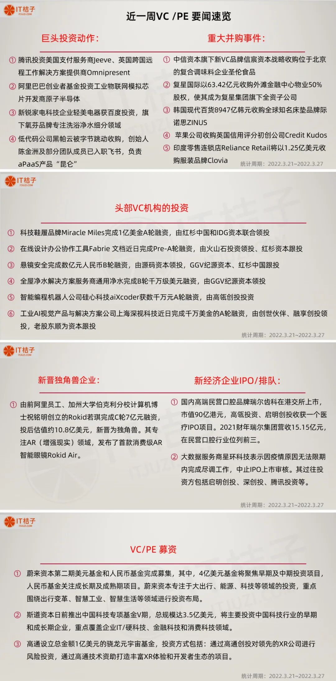1.市场募资动态蔚来资本近日宣布已经关闭第二期美元基金(NIO Capital Eve ONE Fund II L.P.)的募资,本期基金规模约4亿美元,规模是美元一期基金的近两倍。蔚来资本同时已完成二期人民币基金首次关闭。完成募资之后,蔚来资本美元基金将继续聚焦早期及中期投资项目,人民币基金将关注成长期及成熟期项目。蔚来资本专注于大出行、能源、科技等领域的投资,重点围绕出行变革、智慧工业、智慧生活等领域进行投资布局。斯道资本宣布已推出最新中国科技专项基金(“斯道资本中国科技基金V期”),总规模达3.5亿美元,旨在持续捕捉中国科技产业发展的投资机会。斯道资本将进一步深化对核心科技细分领域的关注,这支新基金将主要投资中国科技行业的早期和成长期企业,重点覆盖企业IT/硬科技、金融科技和消费科技领域。高通日前宣布,设立总金额高达1亿美元的骁龙元宇宙基金,用于投资打造独特的沉浸式XR体验以及相关核心AR和AI技术的开发者和企业。该基金计划通过以下方式部署资金:通过高通创投对领先的XR公司进行风险投资,以及通过高通技术公司的资助项目,为打造丰富XR体验(包括游戏、健康、媒体、娱乐、教育和企业级应用)的开发者生态提供资金。