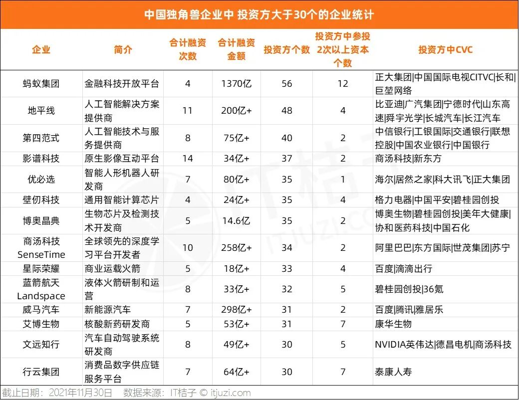 本文重点选取投资方大于 30 的独角兽企业进行分析。