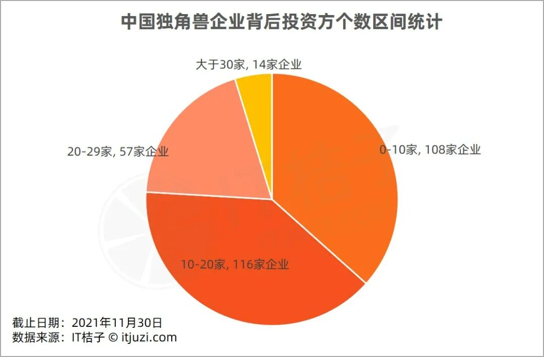 IT 桔子以现有的 295 家中国独角兽企业为样本,统计其背后投资方数量,发现独角兽们背后有 30+投资方的就有 14 家。