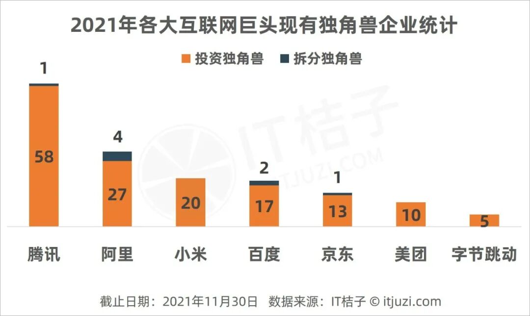 据统计,2021 年中国 295 家独角兽公司中,有 59 家背后有腾讯投资的身影,31 家有阿里系身影,小米和百度分别有 20 家和 19 家,依次排在腾讯和阿里之后;京东参投的独角兽有 14 家,排在第 5;之后分别为美团和字节跳动,其拥有独角兽企业数量分别是 10 家和 5 家。