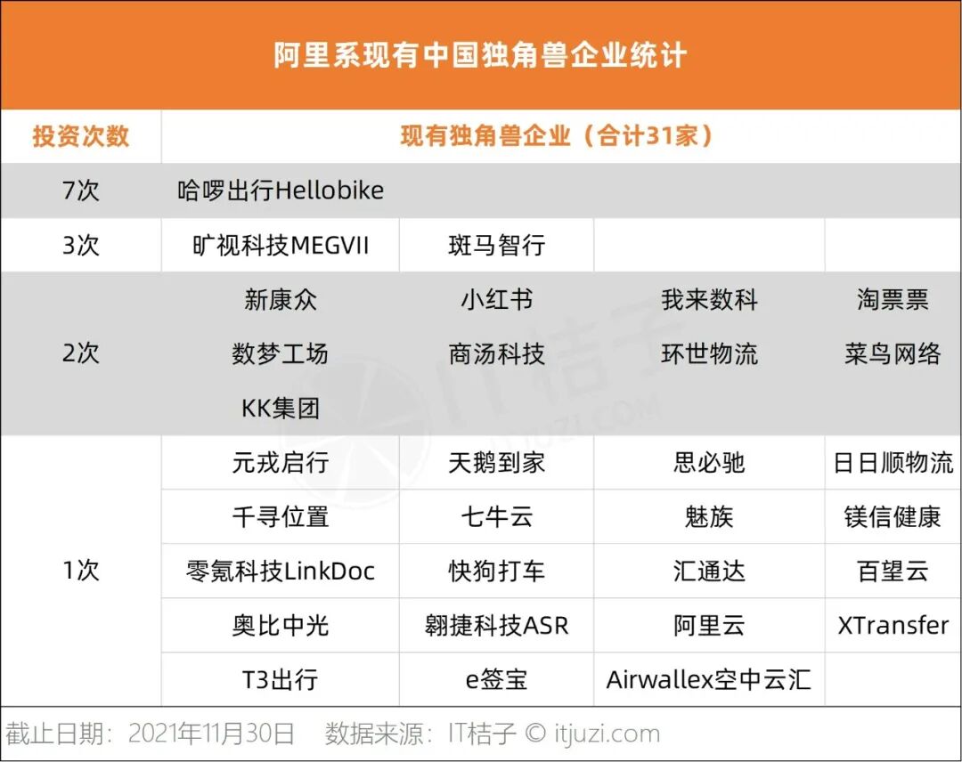 2021 年中国独角兽中,阿里投资或拆分的有 31 家企业,虽较腾讯投资少 28 家,但以数量计,其也仅次于腾讯投资。阿里在 31 家企业中投资 51 次,多次投资同一家独角兽企业的概率并不高。阿里 7 次参投哈啰出行 Hellobike——2021 年 4 月,哈啰出行正式向美国证券交易委员会递交招股书,彼时,蚂蚁集团全资子公司 Antfin (Hong Kong) Holding Limited 是哈啰出行第一大股东,持有公司 36.3% 的股份。7 月 28 日,哈啰出行正式对外表示,已向美国证券交易所委员会发出声明,要求撤回此前提交的 IPO 申请。11 月,哈啰出行再获蚂蚁集团和阿里巴巴联合投资的 2.8 亿美元。