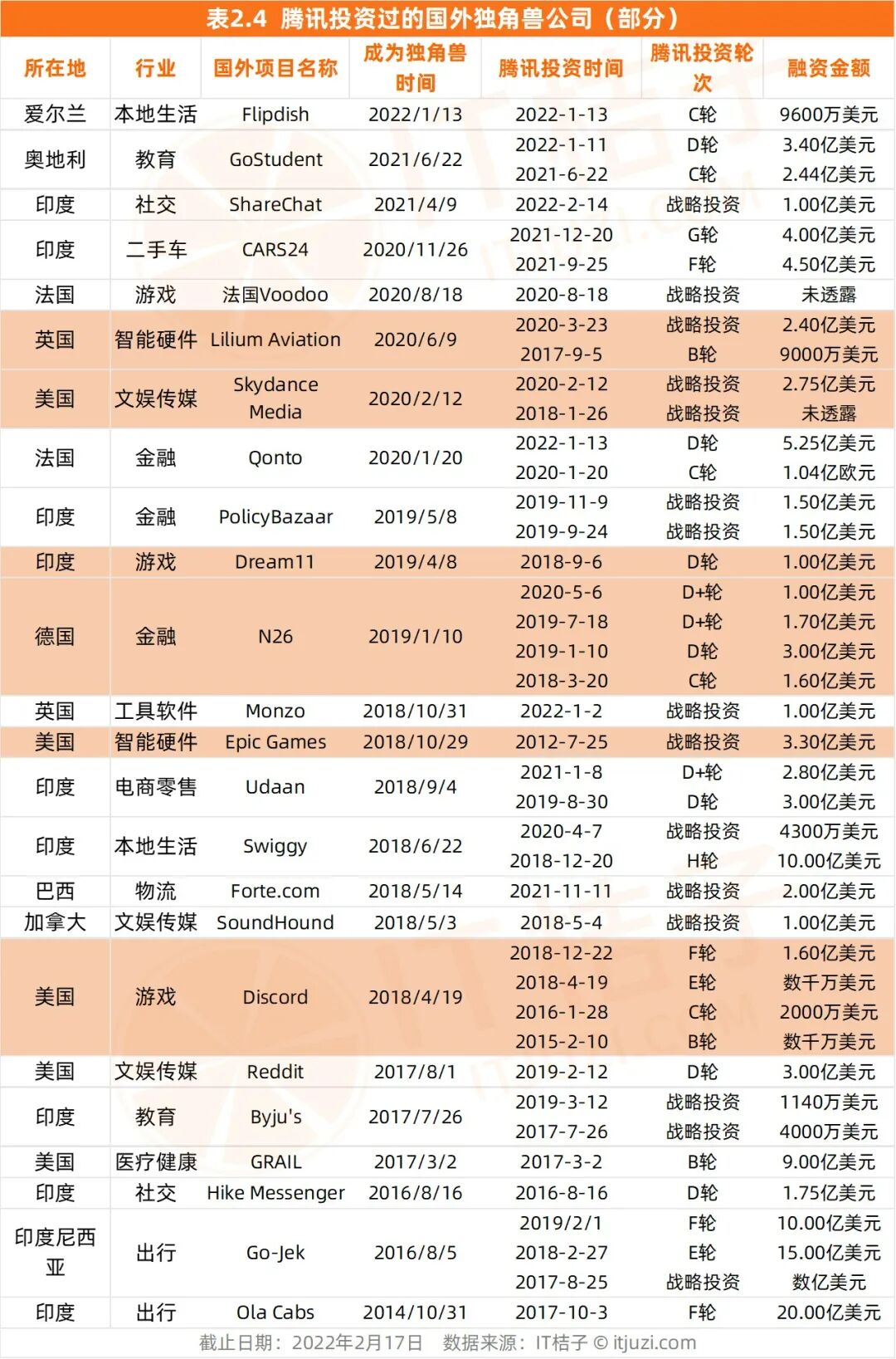 注:融资金额代表该公司本轮的融资额,并不等于腾讯的实际投资金额