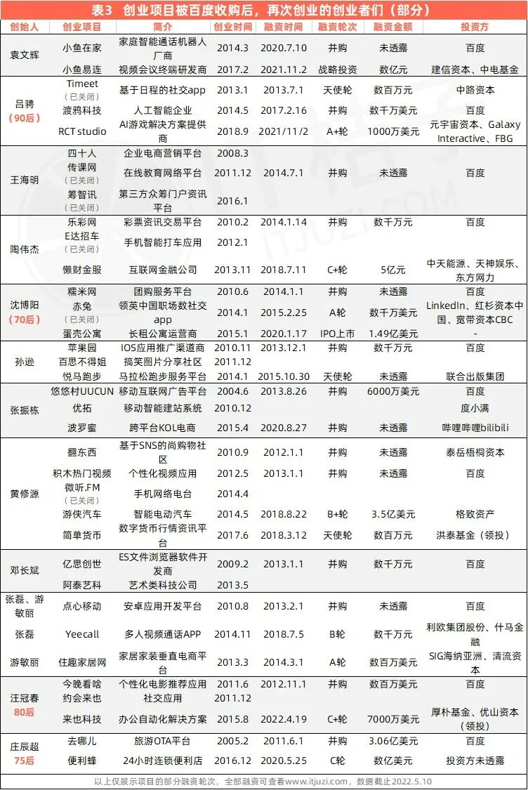 创业项目被百度收购后再创业的包括糯米网创始人沈博阳、去哪儿创始人陈刚和庄辰超、渡鸦科技创始人吕骋、传课网创始人王海明、今晚看啥创始人汪冠春等人;