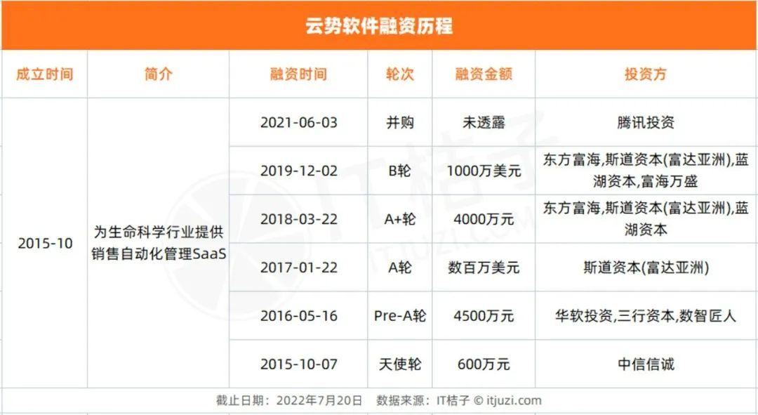在生命科学领域 SaaS 平台市场,国际只有巨头 Veeva 占主导,国内相关公司较少的情况下,云势软件凭借创始人过往经历+行业市场的广阔性+现有公司的稀缺性,自成立至收购前,共获 5 轮融资。第一笔融资就发生在该公司成立的当月,此后东方富海、斯道资本、蓝湖资本加入,并持续为其注资。根据 IT 桔子记录,云势软件成立以来,每年都能收获新融资。4 年下来,云势软件总融资额保守估计在 1.7 亿元左右。
