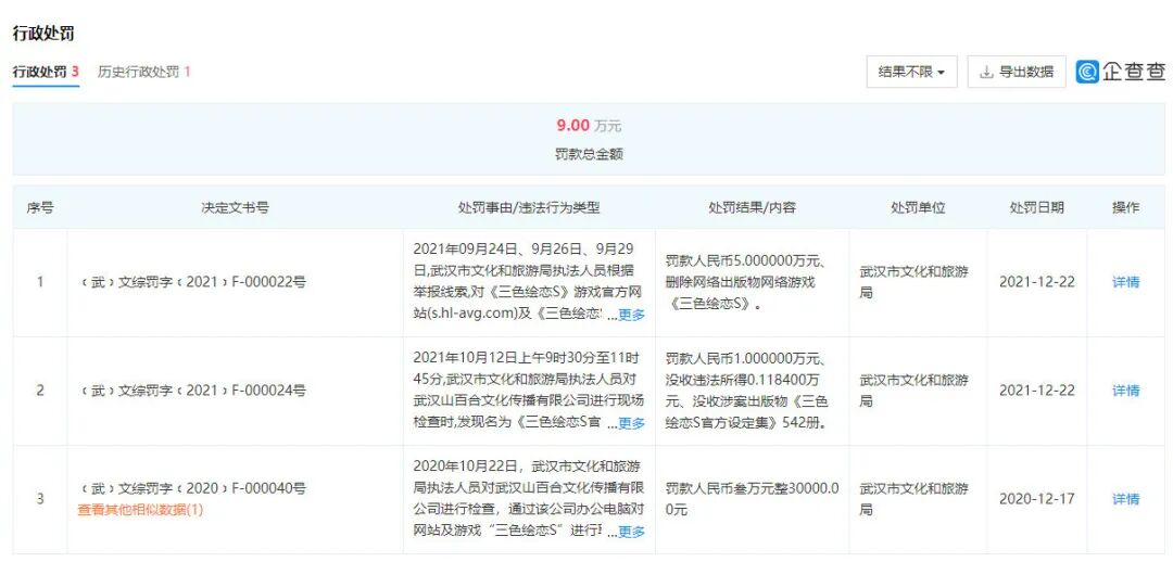 企查查显示,在今年12月22日执行处罚之前,在去年12月17日,山百合已经因为《三色绘恋S》被罚款过3万元;而引起评论者广泛讨论的则是那个“违法所得”的数字——1184元。