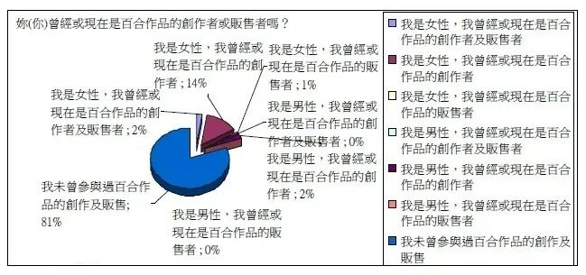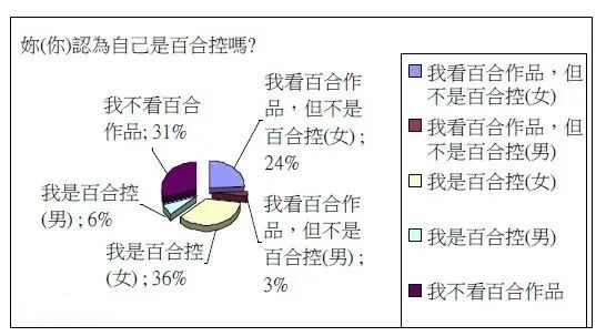 而实际上,根据百合文化研究者杨若晖在2011年进行的,共计回收有效问卷815份的网络调查显示:虽然一半以上的参与者认为百合作品的主要受众是男性,但结果而论,调查中自认为是百合控的人里,女性的数量足足达到了男性的6倍。至于相关的从业者——如百合向同人的创作者和贩售者的性别比例,女性更是达到了男性的8倍。