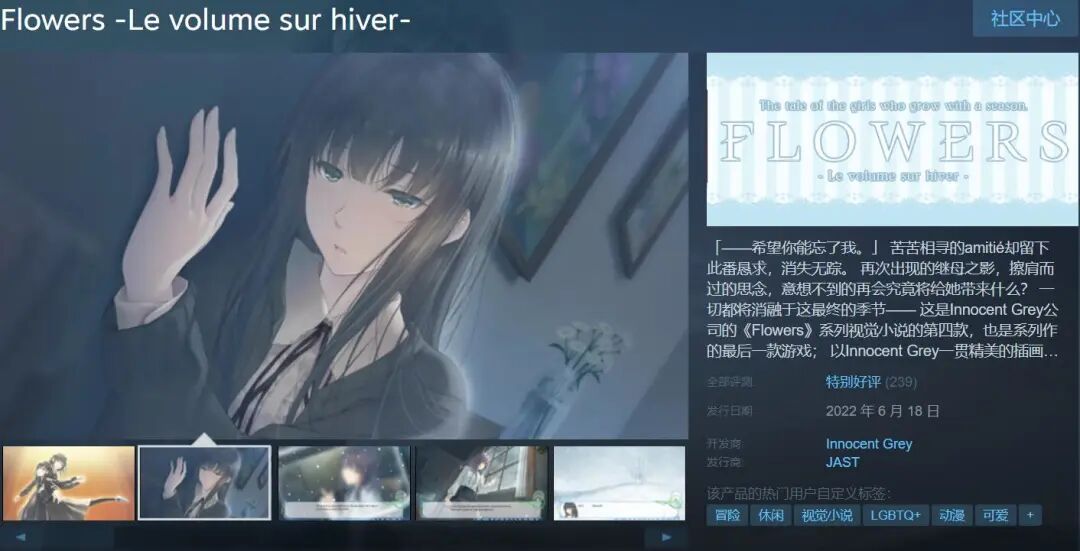 6月18日,Innocent Grey制作的全年龄向百合游戏《Flowers》在Steam上推出了系列的终章《冬篇》。至此,这个在各方面都颇具亮点的系列也算是完整地呈现在了玩家面前。借此机会,我们不妨来聊聊,这部在我看来具备了“百合游戏”一切应有要素的系列,以及它的缔造者,“人如其名”的Innocent Grey吧。